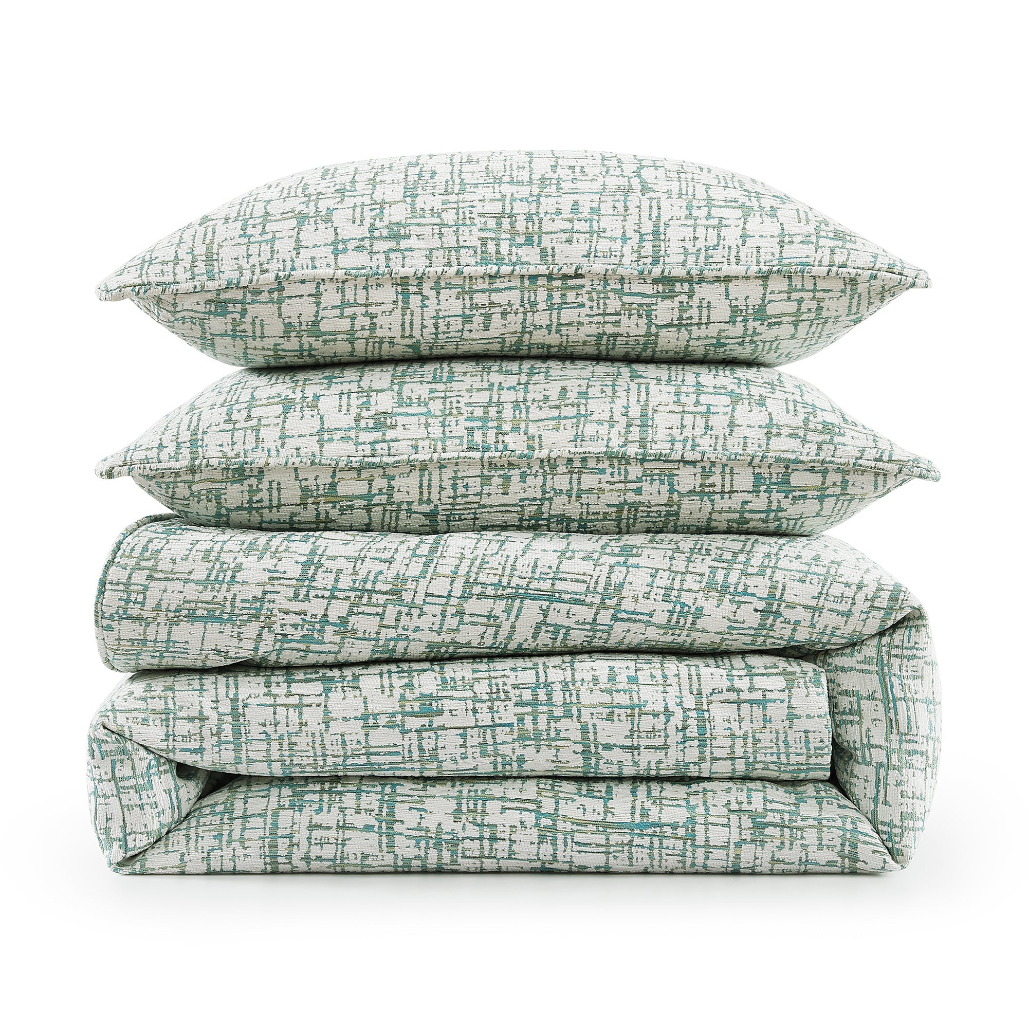 Embrace modern serenity with our Keziah Bedding Set, where architectural precision meets textile artistry. The distinctive cross-hatch pattern in soothing jade green creates a contemporary geometric statement against a crisp white background. Crafted from premium chenille jacquard with space-dyed yarns, this modern luxury bedding offers luxurious softness with subtle dimensional texture. Its tranquil palette of cool greens paired with deep teal accents brings the calming essence of nature indoors, while the durable yet refined construction provides year-round comfort — everyday luxury that's as practical as it is beautiful.